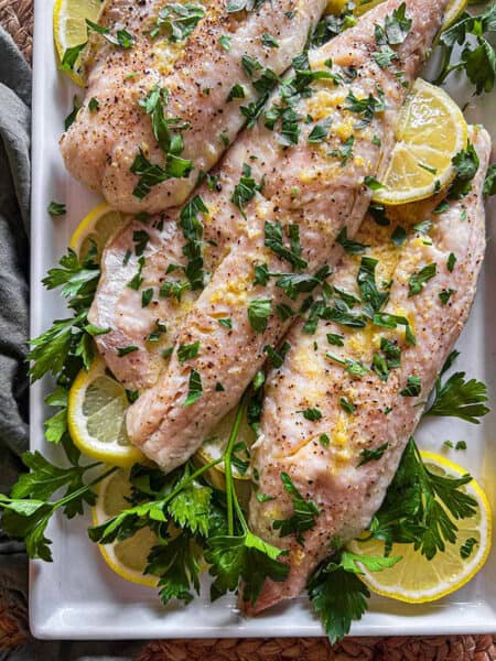 Walleye: This fish is a delicate, mild-flavored whitefish. It has a bit of sweetness and is low on the “fishiness.” It is served grilled with garlic butter and is an amazing seafood option!